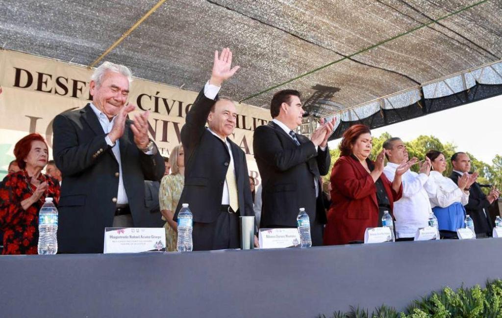Caborca, Sonora; 13 de abril de 2024- Como parte de las actividades conmemorativas del 167 aniversario de la gesta heroica de Caborca, el gobernador Alfonso Durazo Montaño atestiguó el desfile cívico militar donde se congregó la ciudadanía para recordar esta fecha.