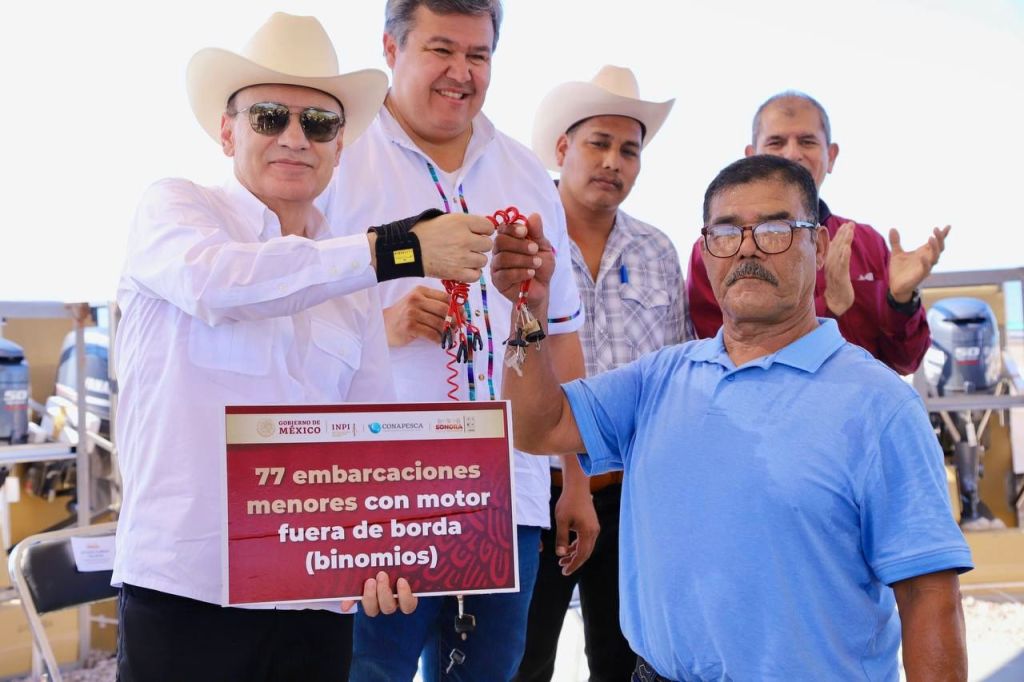Las Guásimas, 27 de agosto de 2024.- En cumplimiento al Proyecto Estratégico para el Desarrollo Pesquero para Justicia del Pueblo Yaqui, el gobernador Alfonso Durazo Montaño y el Comisionado Nacional de Acuacultura y Pesca (Conapesca), Octavio Almada Palafox, entregaron 77 embarcaciones y 77 motores fuera de borda, que en su conjunto forman un binomio, a pescadores de Las Guásimas con lo que suman 303 equipos con una inversión de 106.8 millones de pesos.