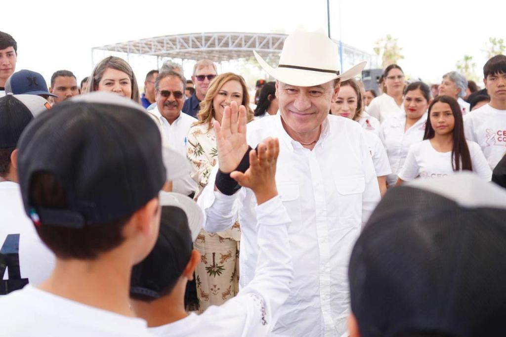 Acompañado por Edna Patricia Serrano Peña, presidenta municipal de Banámichi; Steve Holmes, director de Operaciones de la empresa minera First Majestic Silver Corp y Javier Villareal Gámez, secretario General del Sindicato Nacional de Trabajadores de la Industria Minera Metalúrgica CTM, el mandatario estatal develó la placa conmemorativa y participó en el lanzamiento de la primera bola en la nueva cancha de béisbol, marcando el arranque simbólico de las actividades deportivas en este espacio renovado.